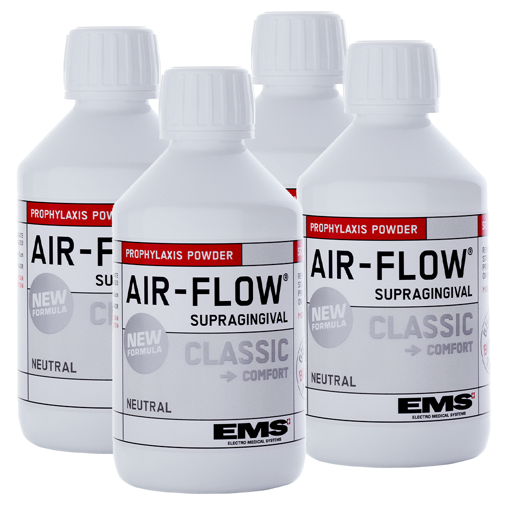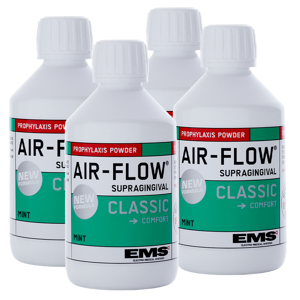 O Pó AIRFLOW® CLASSIC Comfort remove biofilme, manchas e cálculo recente supragengivalmente.